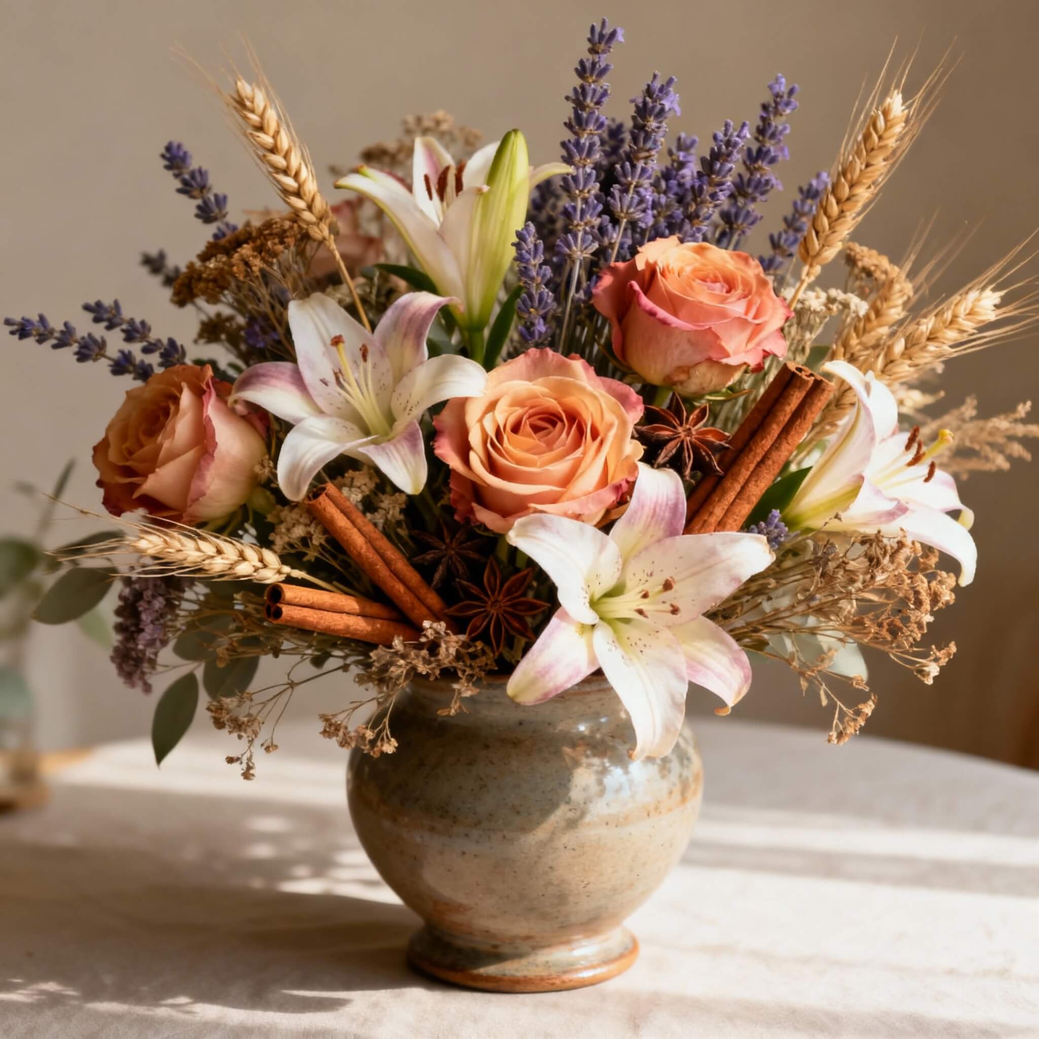 • Materials: High-quality silk floral blend, durable clear wooden vase