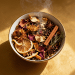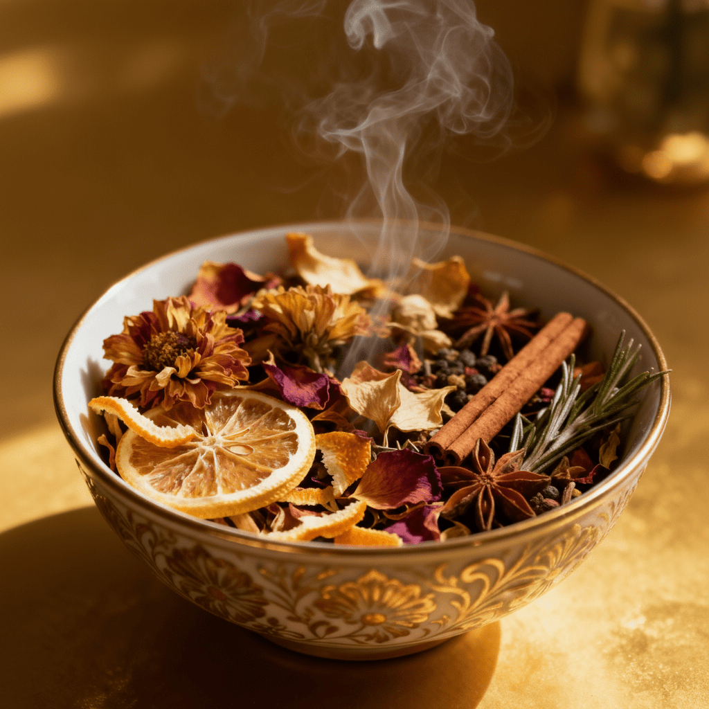 A carefully curated blend of dried natural ingredients—including vibrant rose petals, calming lavender buds, aromatic cinnamon sticks, and citrus peels—designed to gently scent any room. Each mixture is enhanced with a natural fixative (like orris root powder) to absorb the essential oils and ensure a slow, sustained release of fragrance.